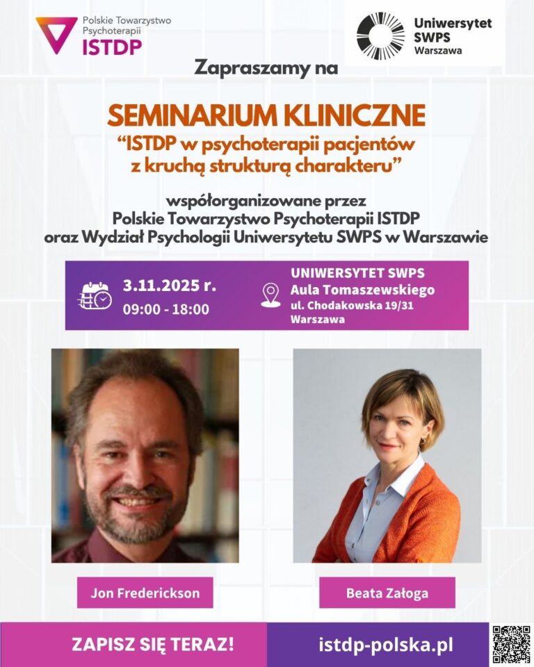 Zapisz się na seminarium “ISTDP w psychoterapii pacjentów z kruchą strukturą charakteru” z udziałem Jona Fredericksona i Beaty Załogi! 3 listopada 2025 Polskie Towarzystwo Psychoterapii